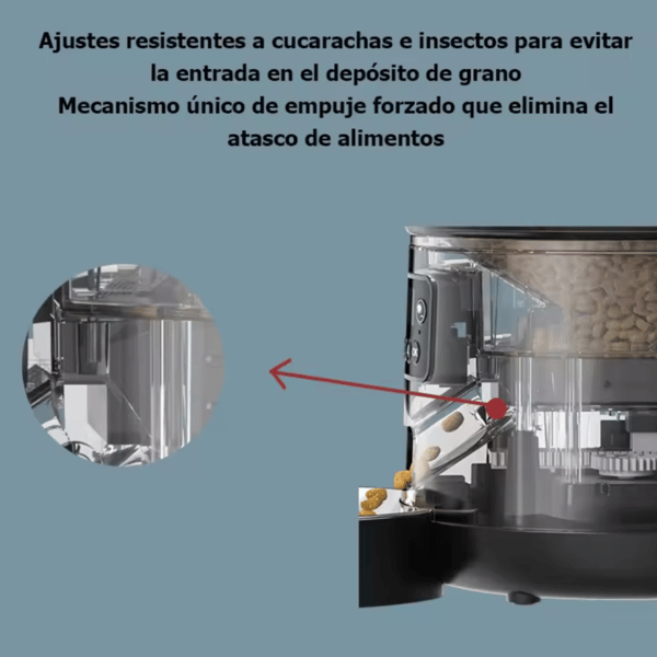 Dispensador automático de comida para gatos con control inteligente y protección contra insectos y enganches.